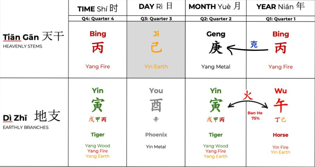 On top of the Yearly Pillar: we see the Heavenly stem (one of the Wǔ Xíng 五行 = Five Phases) as 丙Bing – Yang Fire. Yang fire symbolically has an architype of the Sun – and is big, bright and warm by nature.